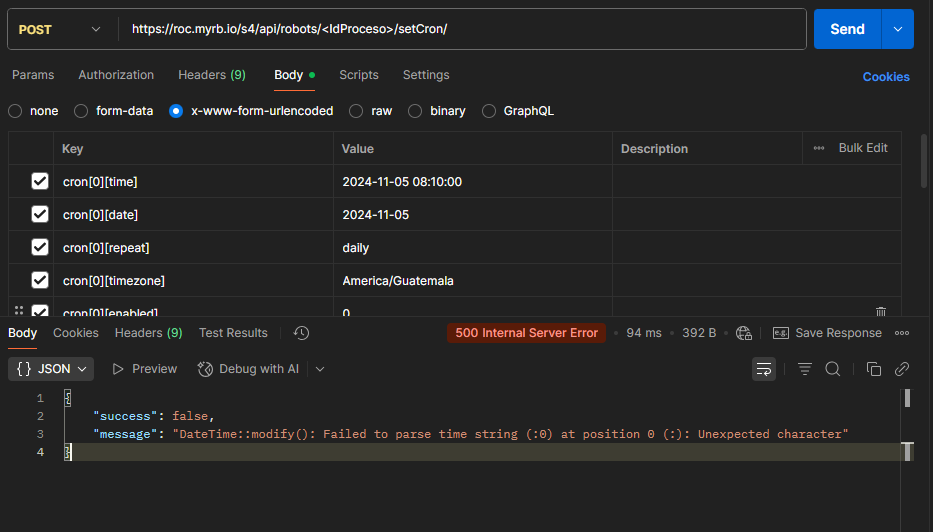 Necesito apoyo estoy queriendo mandar una peticion POST para desactivar los cronjob de manera masiva debido a que tenemos un proceso que necesita todo el dia y necesitamos automatizar la desactivacion de los demas robots asi como tambien cuando finalice ...